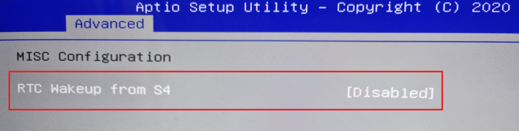 Advanced -> MISC Configuration -> RTC Wakeup from S4 -> Disabled![]() |